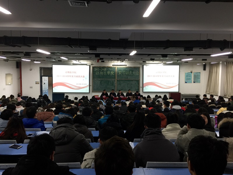 1月12日上午10:00,我院于在一号教学楼合300教室进行2017-2018实习动员大会。党总支书记张瑞春、副院长宋予震、教学秘书吴玉臣、团总支书记王宏魁、辅导员阮宇鹏、聂丹和15级动物医学本科专业、16级兽对和宠对班及17级专升本班全体同学参加此次动员大会,大会由吴玉臣主持。