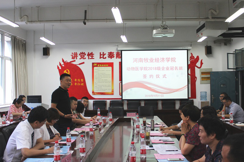9月11日上午,动物医学院在生工楼C401会议室举行2018级企业冠名班签约仪式。校长罗士喜,教务处处长、学院院长边传周,学院党总支书记王春明,河南省猪病防控工程技术中心主任李文刚,副院长石冬梅、党总支副书记张瑞春和来自金宇生物技术股份有限公司、唐人神集团股份有限公司、瑞派宠物医院管理有限公司、北京生泰尔科技股份有限公司、瑞鹏宠物医疗集团股份有限公司、上海安安宠物有限公司、江苏立华牧业股份有限公司、现代牧业(集团)有限公司、宁波佳雯宠物医院管理有限公司等9家企业的负责人出席签约仪式。签约仪式由院党总支书记王春明主持。