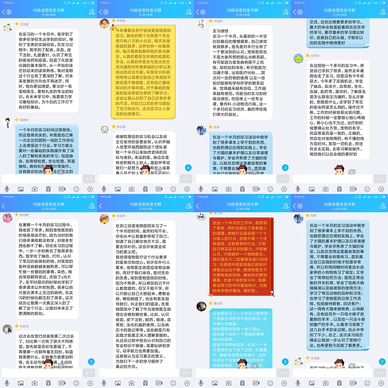 8月27日,浙江佳雯宠物医院在总院召开了优秀实习生表彰大会,学院“佳雯班”的陈梦莉等11名同学用他们的努力、勤奋、汗水在2018年佳雯宠物医院暑期实习工作中,被评为“优秀实习生”。暑期认知实习虽已经划上句号,同学们纷纷表示学习到的专业知识、技能与留在心中的回忆与感受却是难忘的。同学们通过班级QQ群分享了实习期间的体会与感受,深刻认识到学好专业知识的重要性。韩明霞同学说到,此次认知实习不仅拓宽了自己的专业视野,更重要的是让她清醒的认识到专业理论知识联系实际在宠物诊疗行业的重要性。