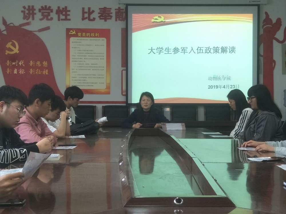 为传达大学生应征入伍相关政策和流程,鼓励学生积极响应国家号召,献身国防事业,四月伊始,我院开展了多种形式的参军入伍宣传动员活动,并于4月23日下午在生工C401召开了大学生应征入伍政策宣讲会,吕玉金老师向各班传达了入伍政策。