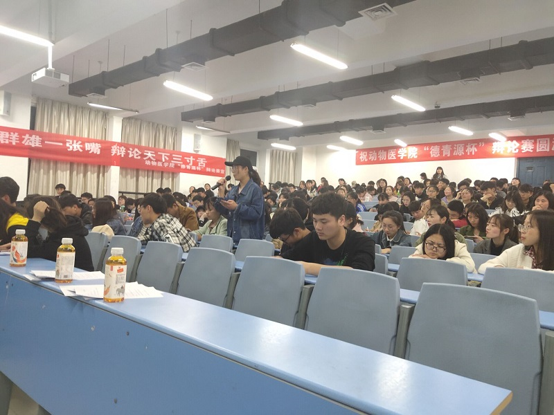 4月26日晚7点,由德青源公司大力赞助的动物医学院“德青源杯”辩论赛决赛在1号教学楼合400教室举行。担任本次活动评委的有17级的刘西顺,张钰灿,郭亚晶,乔钧培及学生会部分成员。