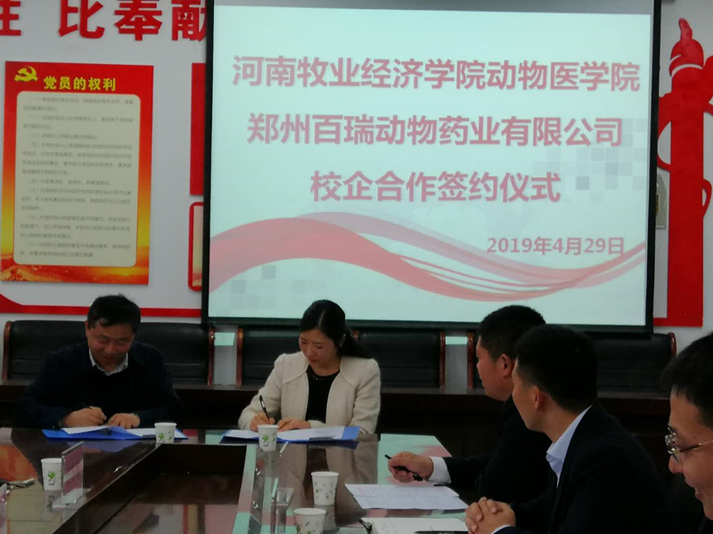 为充分发挥动物医学院和郑州百瑞动物药业公司在信息、科研、人才、技术等方面的优势,促进产、学、研互动交流,资源共享及合作发展,提高学校人才培养、科学研究、社会服务质量和水平,促进反刍动物健康发展。2019年4月29日下午3:00,在龙子湖校区生工组团C401室举行了双方的合作签约仪式。参加本次签约仪式的领导有郑州百瑞动物药业公司董事长郭玉凡、总经理陈盟、牛羊部经理牛思原、技术部经理刁新科、人事部经理毛平平,动物医学院院长边传周、党总支书记王春明、科研副院长石冬梅、教学副院长宋予震及我院的部分老师。会议由王春明书记主持。