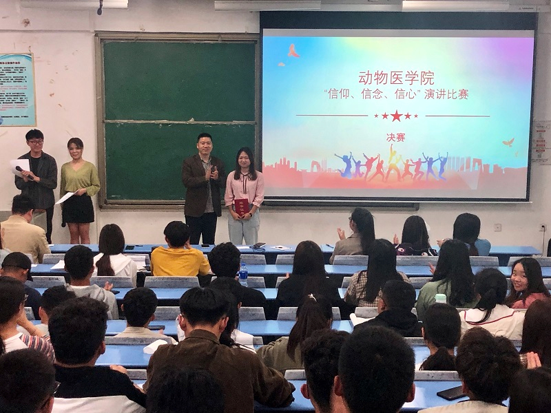 5月5日晚上7:00,按照动物医学院《2019年上半年大学生思想政治教育主题活动方案》安排,恰逢五四青年节之际,学院于合2014教室开展以“信仰 信念 信心”为主题的演讲比赛。参赛对象为各学生班党员、预备党员、入党积极分子,学院团总支书记王宏魁、辅导员付文凯与140余名学生共同参加了此次活动。