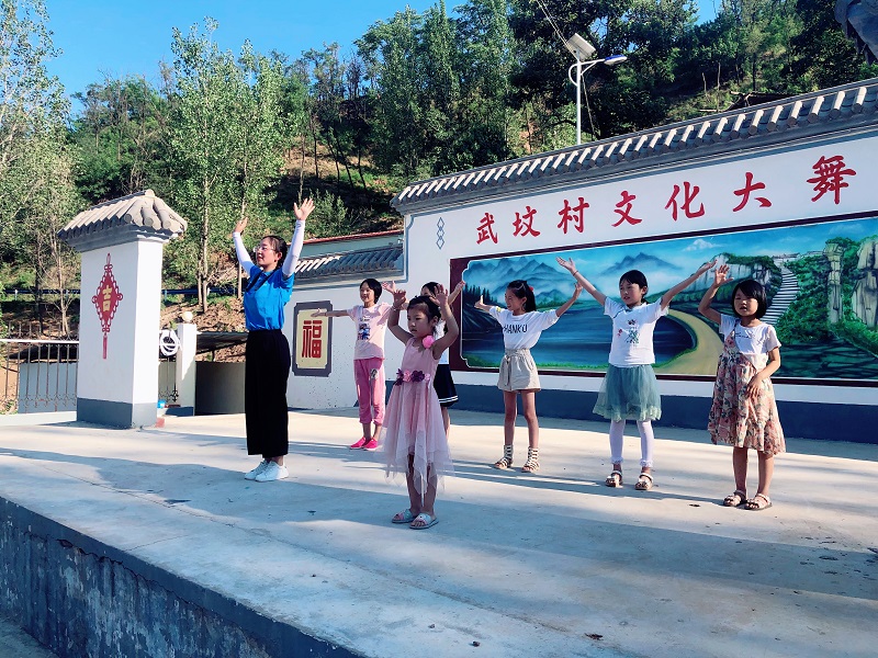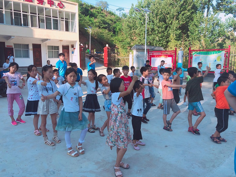 7月4日下午17:00,我院“知与行”暑期社会实践小分队在武坟村文化大舞台上教小朋友们学习儿童舞蹈《天天向上》。
