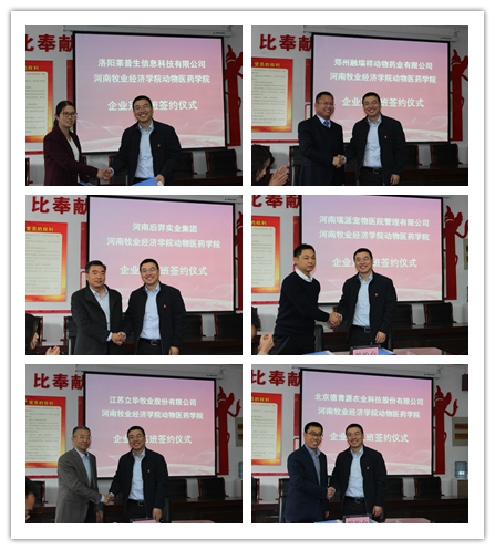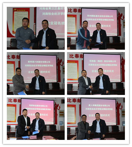 为深入贯彻落实“不忘初心、牢记使命”主题教育,学习习近平总书记在河南考察时讲话精神,共同探讨校企合作新机遇和人才培养新模式,10月17日上午,动物医药学院于生工楼C401会议室举行2019级企业冠名班签约仪式。校长罗士喜、社会服务办公室主任胡迎利、党委宣传部副部长张瑞春、动物医药学院党委书记刘永录、院长宋予震和来自北京德青源农业科技股份有限公司等17家企业的负责人出席签约仪式。签约仪式由院党委副书记汪洋主持。