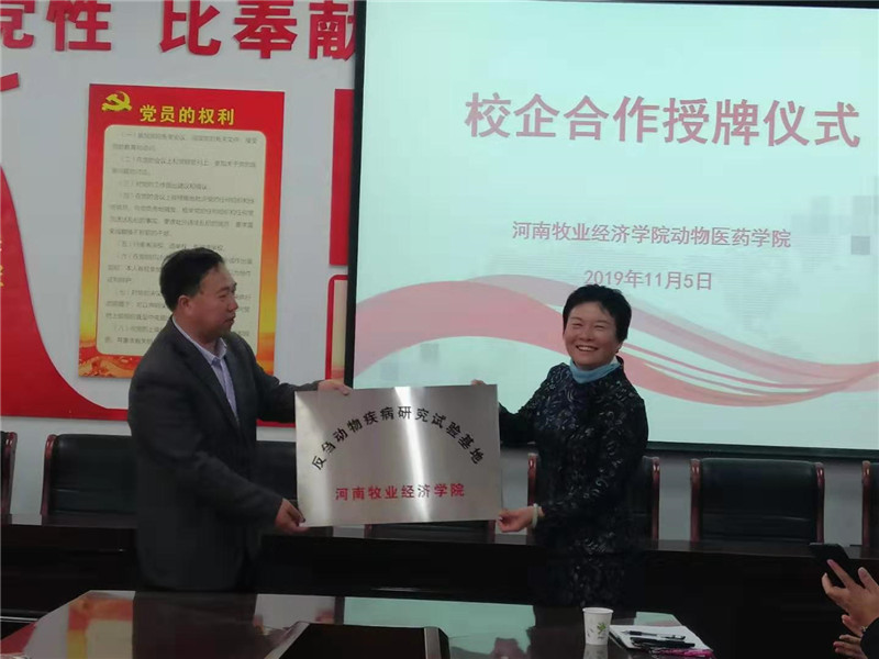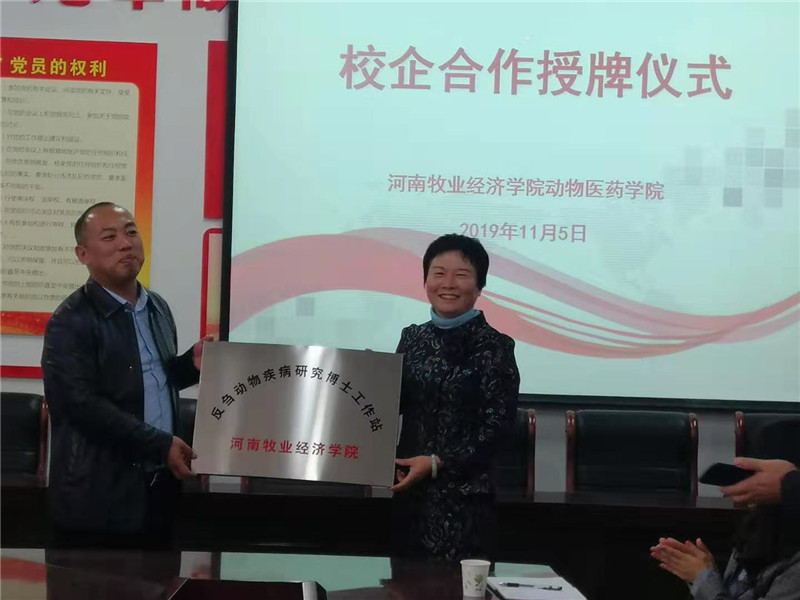 李利红副院长首先对两位专家的到来表示热烈的欢迎,随后介绍了动物医药学院的师资队伍、学科建设、专业建设、校企合作,以及学生培养等方面的基本情况。紧接着,举行了授牌仪式,石冬梅教授为河南省奶牛生产性能测定中心张震主任颁发了“反刍动物疾病研究博士工作站”匾牌,为河南花花牛畜牧科技有限公司王相根总经理颁发了“反刍动物疾病研究试验基地”牌匾。