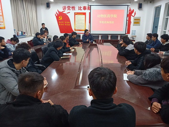为贯彻落实习近平总书记关于宪法学习宣传教育的系列重要指示精神,引导青少年学生了解宪法知识理解宪法内涵,我院于2019年12月2日晚19:00点在生工楼C401举行动物医药学院学宪法知宪法活动,本次活动由康宇老师主持,19级全体班长及考勤班长共同参加。