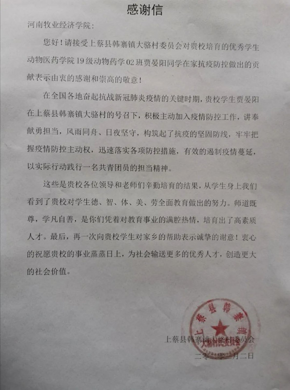 近日,河南省驻马店上蔡县韩寨镇大骆村民委员会发来感谢信,对我院2019级动物药学2班学生贾晏阳同学在家乡疫情防控工作中的突出表现予以表彰和感谢。