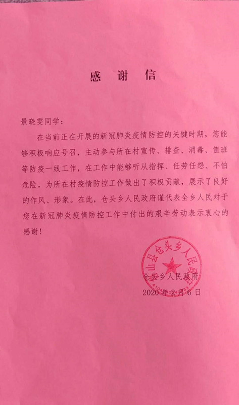 河南省平顶山市鲁山县仓头乡人民政府发来感谢信,对我院2018级动物药学一班景晓雯同学在家乡疫情防控工作中的突出表现予以表彰和感谢。