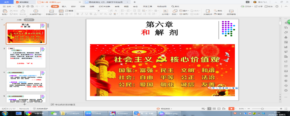 乔卿梅老师《方剂与中成药》的“和解剂”部分将社会主义核心价值观之“和谐”和习近平总书记“和而不同,美美与共”大国外交理念融入其中,增强学生中国传统文化自信。