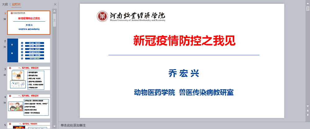过去的一个多月,动物医药学院教师因课而异、平台各异、形式多样而、紧张有序的网络教学,不仅实现了“停课不停学、不停教”,更积极主动在“虚拟”课堂中推进价值塑造,把抗“疫”过程中的典型经验与教训变成教育教学中的“活教材”,对学生进行爱国主义、自律精神、生物安全与公共卫生教育培养,做到“停课不停育”。