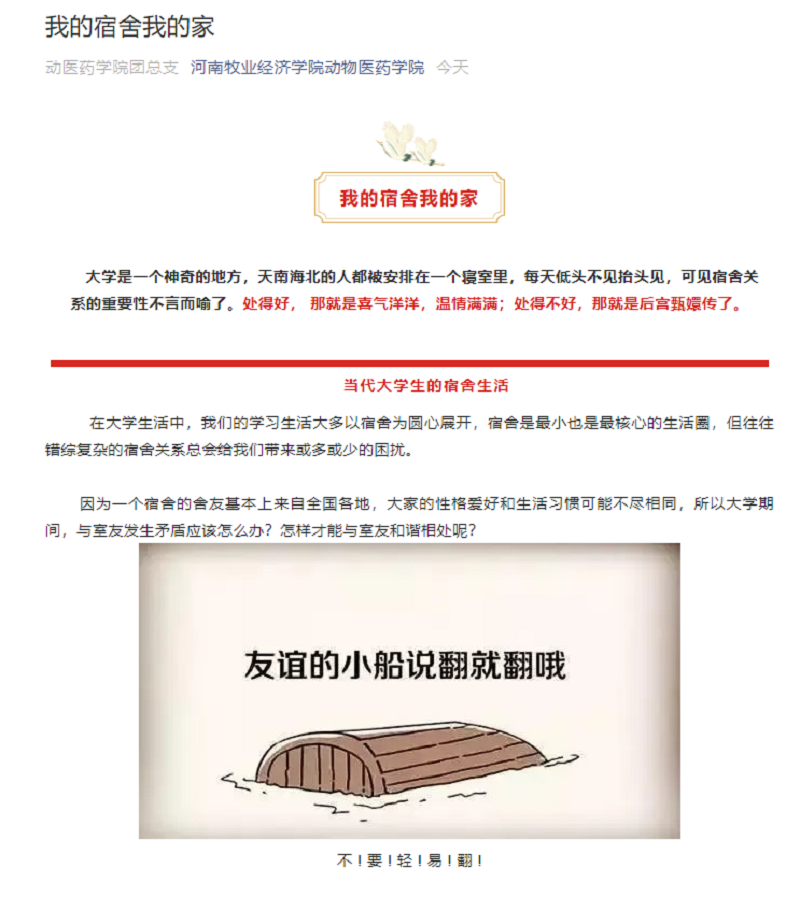 通过绘制展板,向同学们宣传心理健康知识;通过微信公众号,向同学们介绍寝室之间的相处之道、调节心理的小方法和小妙招;通过和新生班级的心理委员开座谈会,向他们强调了日常生活中,尤其需要留意的几类学生,将心理委员的工作方式与方法传授给他们。