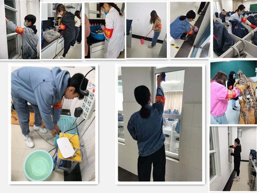 志愿者们统一佩戴口罩、志愿者袖章和手套,到达实验室后在实验室助理的带领下分别到一楼和四楼的实验室打扫卫生。打扫的主要内容有清扫地板、擦拭动物骨骼标本、桌台以及规范摆放实验室设备。本次志愿者活动持续数个小时,志愿者们不辞辛苦认真完成任务,在认真打扫实验室内部的同时积极帮助老师与其他同学。打扫结束后,同学们纷纷自发与干净整洁的实验室合影留念。通过开展本次活动,让同学们不仅处在迎评的环境中,更重要的是能心系评估。同学们表示从劳动中收获快乐的同时深刻意识到学校迎接评估时自己是不可或缺的重要力量。