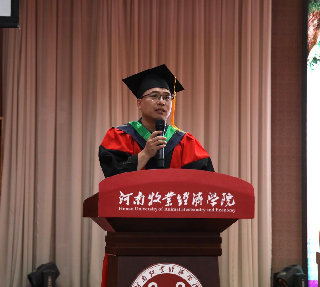 典礼在庄严的国歌声中拉开序幕。与会领导老师为2021届专科毕业生代表颁发毕业证书;副院长汤法银宣读《关于授予 余贝贝 等 445名同学学士学位的决定》,台上10位导师依次为获得学士学位的同学扶正流苏,颁发学士学位证书。接着,预防兽医教研室张晓战博士作为教师代表发言。张老师希望同学们离开校园后能振翅高飞,探索更大更为丰富多彩的世界。并给毕业生送去了真挚的毕业寄语:一是保持学习;二是善于总结反思;三是学会选择;不管你们未来从事什么行业,走的路有多远,河南牧业经济学院永远是你们的家,动物医药学院的老师永远是你们的家人。毕业生代表刘东华同学表达了对学院领导老师的感谢和毕业前的依依惜别之情,并向在校的学弟学妹们提出了丰富的大学生活建议,并告诫同学们要珍惜大学的美好时光,努力变成一个更加优秀的人。尉斌母亲许斐艳女士作为毕业生家长代表发言,她表达了对自己孩子顺利毕业的喜悦并肯定了学院老师的付出与努力,感谢学校学院四年来的栽培。