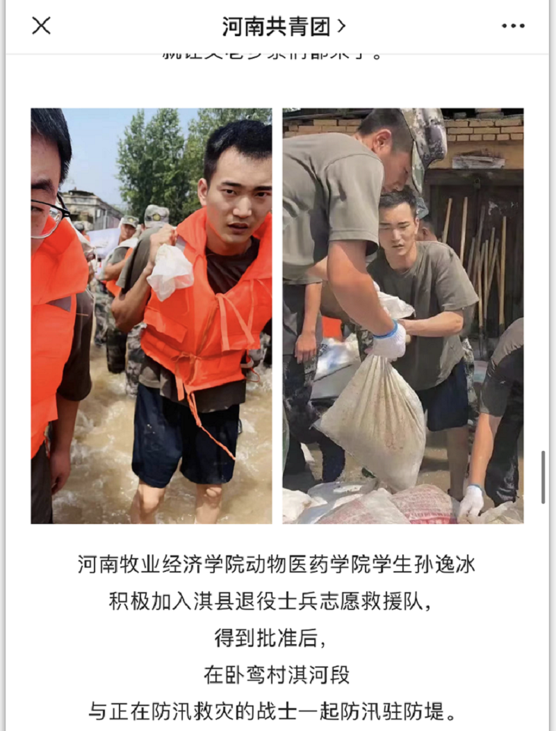 我的家乡让我来守护,防汛抢险我先行。动物医药学院20动医升本02班孙逸冰同学战斗在防汛抢险的最前线。孙逸冰是一名退伍军人,2014年参军入伍,成为武警陕西总队的一名士兵。当兵期间,曾获得“优秀士兵”荣誉称号,作为“爱警精武好战士”受到嘉奖表彰,并于2016年退伍。7月24日,因泄洪、决堤等因素,鹤壁市淇县下属乡镇水位内涝,北阳镇部分村庄水位高达颈部,其他部分村庄水位达到腰部,情况十分紧急,多数老人、儿童以及放暑假的学生被困,时刻危及生命。在灾难面前,孙逸冰主动请缨,成为淇县退役士兵志愿救援队中的一员,在队长臧凯的组织下,带上县武装部提供的皮划艇、救生衣、探照灯等救援装备,第一时间志愿对鹤壁市淇县北阳镇水屯村、玖州国际物流园等多村庄进行人员搜救和转移。经过大家数夜数小时的英勇奋战,救援和转移玖洲国际物流园人民群众约150人左右。另外,由于鹤壁市淇县西岗乡镇受灾比较严重,只能转移群众,放弃以南村庄,保以北的人民群众和村落,需要紧急驻防堤。孙逸冰所在的淇县退役士兵志愿救援队紧接着转战西岗镇。经西岗镇政府批准后救援队主动参与到了正在抗洪救灾的中国人民解放军第83集团军空中突击旅的一线驻防堤任务中,与官兵们一起抗洪驻防堤。孙逸冰同学与83集团军并肩作战,拿着铁锹铲沙,用手接力运输沙袋,筑牢河道防堤。积水漫过膝盖,雨水淋湿全身,顾不上停歇,又给当地转移安置的灾民卸被褥,转运救灾物资,在淇县黄洞乡山区的石老公村和温坡村,孙逸冰和其他救援队员携生存物资爬陡坡、走断路、过山洞,最终将47箱牛奶,10箱面包,18箱泡面送到了当地群众避难处。“若有战,召必回”,孙逸冰同学义无反顾,勇往直前,始终保持青春在迎风斗雨中闪光!