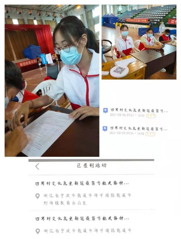 20动药02班张嘉仪,家在浙江省宁波市慈溪市海中南路慈溪市附海镇,在新冠肺炎疫情防控工作期间,她报名参加了疫苗接种志愿服务活动。她表示,作为一名大学生,应该肩负起青年人的责任,实践“奉献、友爱、互助、进步”的志愿精神。张嘉仪同学在四界村文化礼堂新冠疫苗方舱式接种志愿服务中帮助来打疫苗的人员进行信息登记、解答接种人员的疑惑、控制进出人流量、维持现场秩序。她说:“在帮助来打疫苗的人员进行信息登记时,有一些年龄较大的老人不识字,也不会用手机扫码,我会主动帮助他们进行登记,询问我问题时,耐心仔细的与他们讲解,让大家更高效更安全的接种疫苗。虽然连续两天下来真的感觉很累,但一想到能为社会奉献出自己的微薄之力,就感到非常开心。而且我在这里也认识很多善良的大哥哥大姐姐,他们也都很关心照顾我,我有什么问题他们也会很热情的帮我解决,同时也收获了很多。” 张嘉仪同学还强调她会继续把志愿活动做下去,社会的进步需要全社会的共同参与和努力,大学生志愿者用志愿服务书写青春风采。