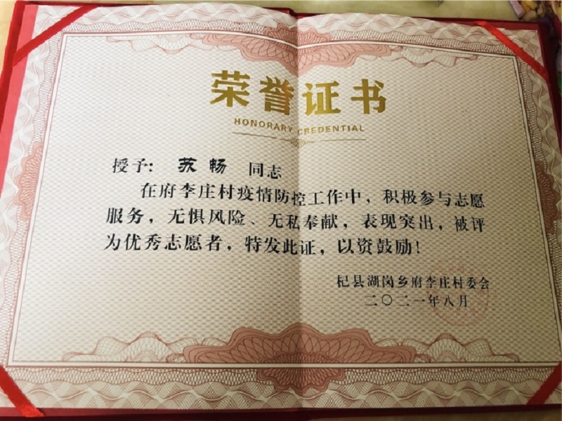 在核酸检测工作中,苏畅的任务是进行现场秩序疏导、体温测量、健康码核查、录入核酸检测信息,并不时安抚等待人员的情绪。其中有些老人不识字,他也积极耐心的帮助完成登记工作。随后,根据疫情防控的要求,需对居家隔离人员进行核算采集工作,这个任务就由早已经过专业培训、而且蓄势待发的乡村医生苏畅的父亲完成。苏畅在得知需要一名助手协助时,他毅然决定做父亲的助手,正所谓 “上阵父子兵”啊。苏畅表示:“在志愿服务中,我深刻体会到无私奉献的精神,懂得了做好志愿服务工作需要拥有严谨的态度和足够的耐心。虽然过程有很多心酸与不易,但只要众志成城,共渡难关,就一定能打赢这场疫情防控的阻击战。”
