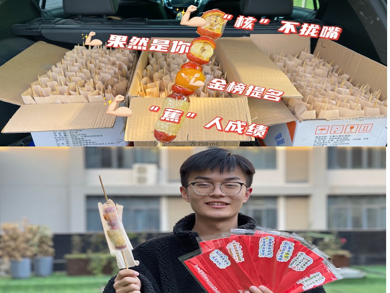 “考研加油包”包含两个定制口罩和一串饱含寓意的糖葫芦。疫情常态化背景下,学院为每个考研学生准备了两个定制口罩,口罩上印有“动物医药学院祝2022届考研学子成功上岸”的字样,上面贴有写着祝福语的精美贴纸,“前路浩浩荡荡,万物皆可期待”、“满怀希望就会所向披靡”、“熬过最苦的日子,做最酷的自己”,写下了我院师生对于考研学子的祝福。糖葫芦由核桃、坚果、金桔和香蕉穿成一串儿,坚果寓意“果然是你”,借香蕉、金桔、核桃的谐音祝福考研学子们都能考出“蕉”人成绩,金榜题名,笑的“核”不拢嘴。“20211202”—在这个正也顺、反也顺的好日子,收到“考研加油包”,现场不少考研学子表示,“有心了。”“太暖心。”“我们也是别人家的学校了!”