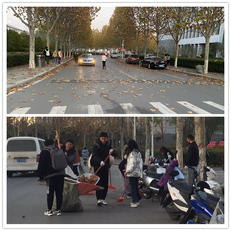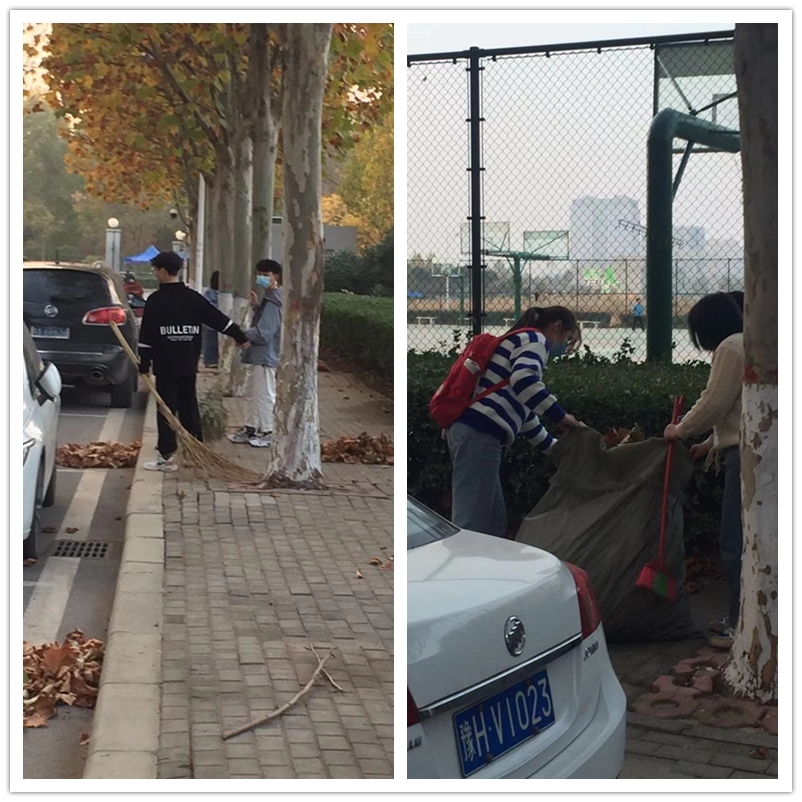 本次劳动实践周,根据打扫面积、落叶多少等因素,我院将校园划分成三个区域,以班级为单位,分别负责一块儿区域,再由班长将全班学生化整为零,分成若干小组,具体负责一段路或一片区域。每周一晚上,各班召开小组负责人经验交流会,互相交流打扫经验,并根据实际工作量,灵活分配各区域小组人员。