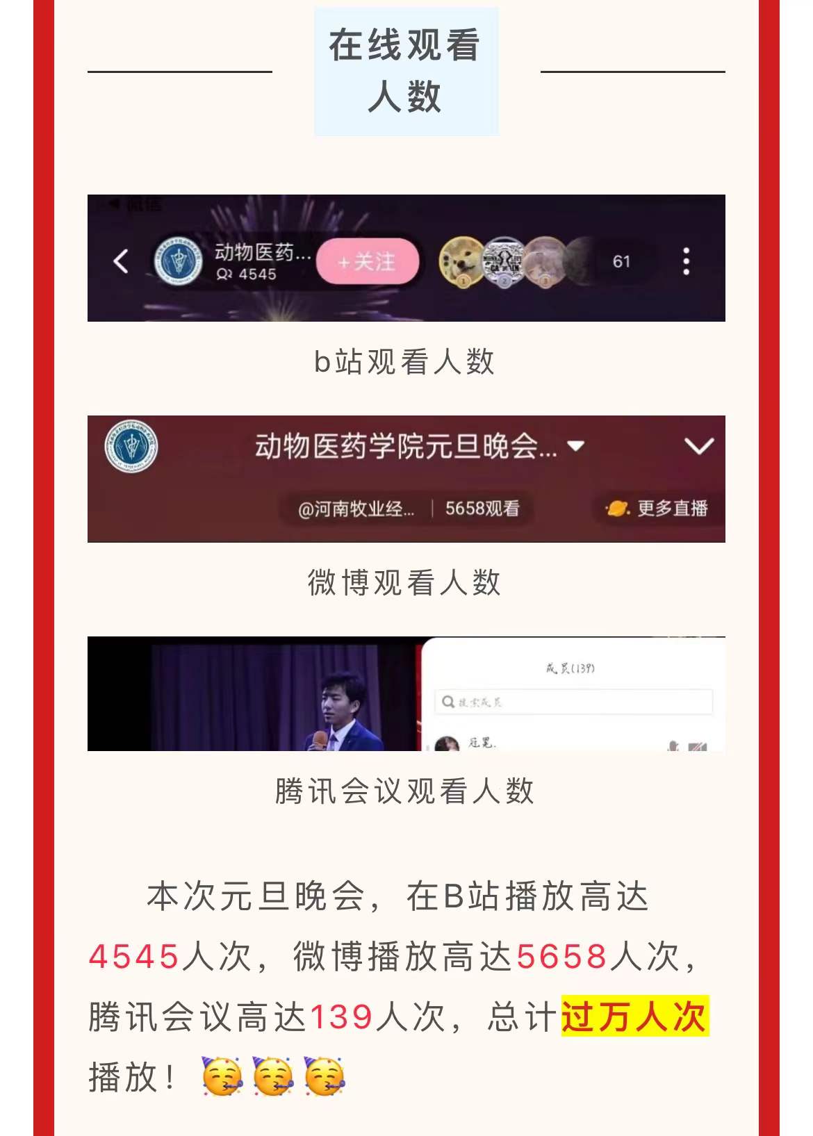 回顾过去,总有一种自豪让我们心潮起伏。展望未来,总有一种力量催我们奋发向前。为迎接新一年的到来,动物医药学院于2021年12月31日晚七点,在我院官方微博、b站以及腾讯会议三个平台同步上线“开启党史新征程,师生欢聚‘云’联欢”动物医药学院2022年元旦晚会。本次元旦晚会,在B站播放高达4545人次,微博播放高达5658人次,腾讯会议高达139人次,总计过万人次播放。