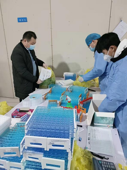 许昌博奥润康医学检验实验室内,21动药04的王旭洋在认真的摆放核酸检测样本。他的工作主要是将各个街道办事处、医院以及禹州的核酸检测样本按要求摆放好,检查是否与送样人统计的数量一致,并在出现问题后与他们沟通如何解决问题,以在最短时间内将送来的样本投入检测环节。从1月5日至今,他对这份工作保持着初心,没有丝毫懈怠。面对样本和送检单数目不对等的情况时,他总能第一时间与送样人沟通并联系社区负责人处理。