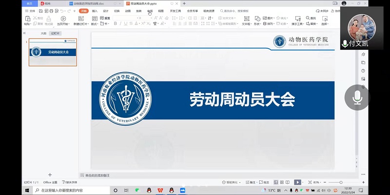 为全面贯彻党的教育方针,让同学们充分认识开展劳动教育的重要意义,确保我院劳动周顺利实施,动物医药学院于2022年3月24日中午采用线上的形式,于钉钉会议上举行劳动周动员大会。院团委书记樊明明、辅导员付文凯、院学生会生活部、21级专升本班和中兽医班的班委参加本次会议。