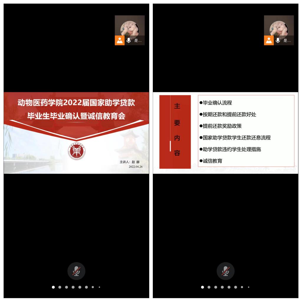 根据我校《关于做好2022届国家助学贷款毕业生毕业确认工作的通知》的要求,为进一步提高动物医药学院学生对助学贷款政策的正确认识,增强学生的诚信意识,做好2022年贷款毕业生的还款和毕业确认工作,了解学生在还款方面的有关疑惑,动物医药学院于4月26日开展了以“感恩资助,诚信还款”为主题的线上诚信教育会议,我院资助专员赵赫老师及全体国家助学贷款毕业生参加此次会议。