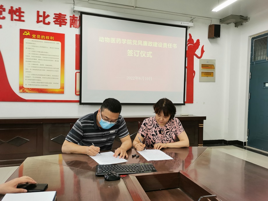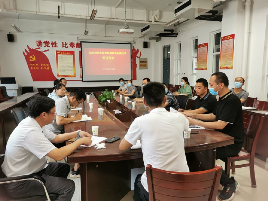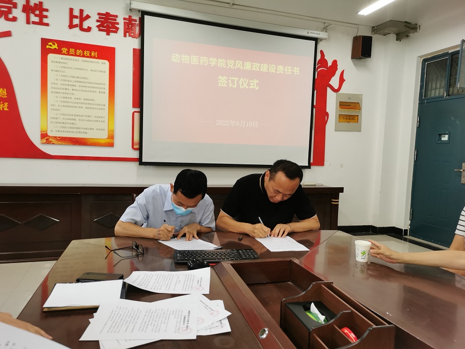 5月28日下午,动物医药学院在生工楼C401会议室举行了2022年党风廉政建设责任书签订仪式,按照职责分工,学院领导班子成员分别与正处级组织员、副书记、副院长、党支部书记、教研室主任、科级干部签订了党风廉政建设责任书。