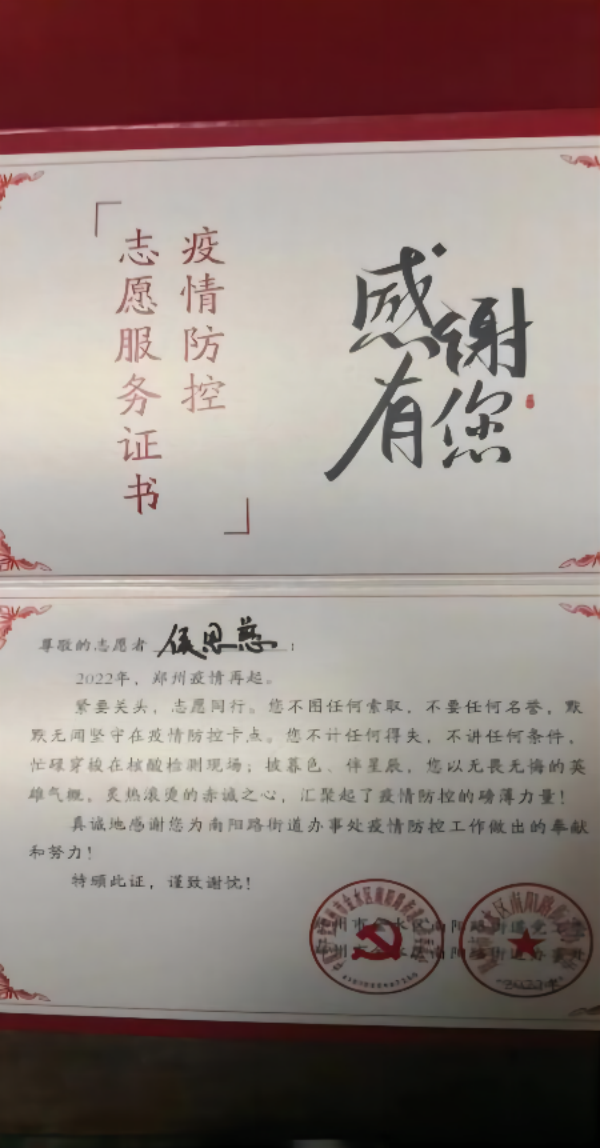 面对暑假期间疫情反弹的社会现状,21动医02班的侯恩慈毫不犹豫地加入了河南郑州疫情防控阻击战志愿者的大家庭里。她负责的区域居民普遍老龄化,自身防控意识淡薄,防疫物资匮乏,疫情防控的任务非常艰巨。作为一名疫情防控志愿者,她同其他工作人员及其他志愿者24小时值守在辖区,全心投入到疫情防控宣传、进出口检查、站点值守、居民摸底调查、重点部位消毒、帮助居民采购生活物资等等。工作中在一线很苦、很累,熬夜加班是常态,可辖区居民在微信群里对侯恩慈表示认可时,她感到自己的付出非常值得,非常欣慰。
