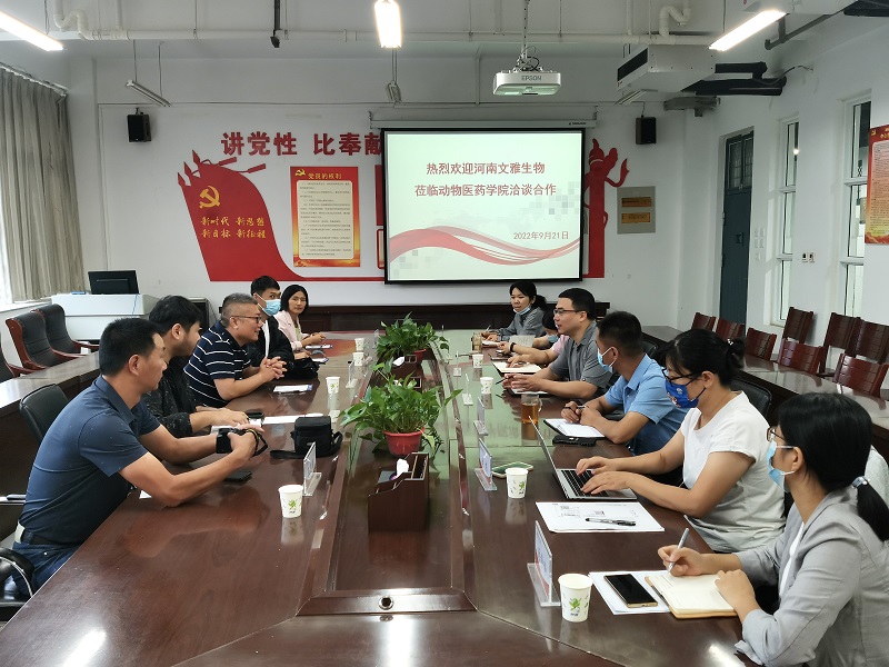 2022年9月21日上午,河南文雅生物科技有限公司总经理王仁周一行莅临动物医药学院开展校企合作洽谈,学院院长宋予震、副院长吴玉臣以及各教研室主任共同参与了洽谈会,会议由学院院长宋予震主持。