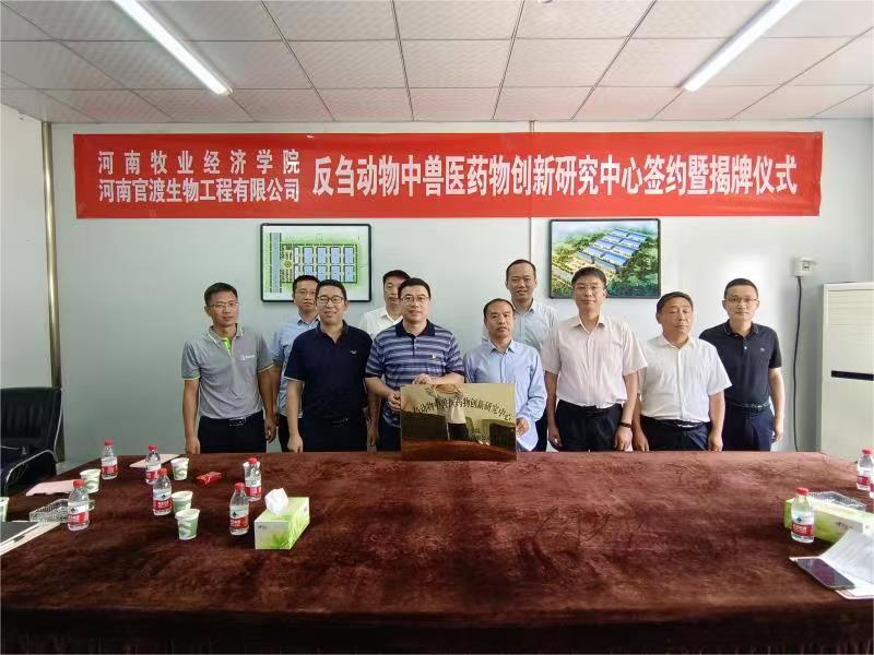 河南官渡生物工程有限公司董事长韩文拴介绍了公司历史与生产概况,宣读了郭振环博士的任命书。宋予震院长和韩文拴董事长一起为“河南牧业经济学院•河南官渡生物工程有限公司反刍动物中兽医药物创新研究中心”揭牌。随后,宋予震院长等一行人在总经理徐超军陪同下,参观了企业的各条生产线。(图/文 汪洋)