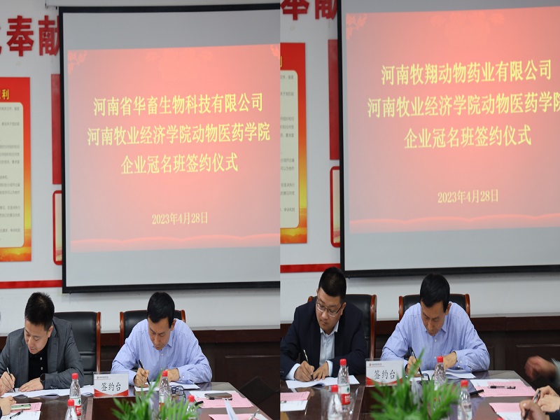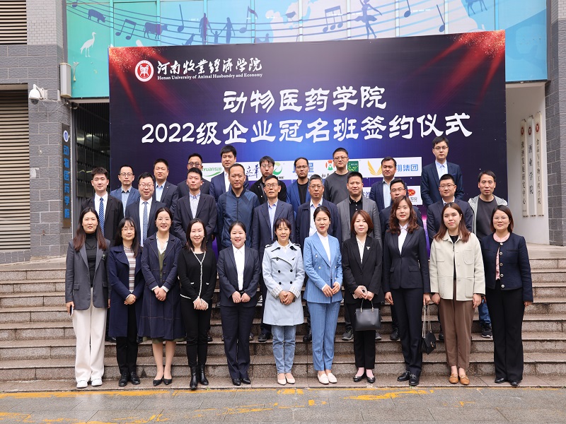为进一步深化产教融合、校企联动,把院党委主题教育做到实处,创新人才培养方式,切实提高人才培养质量。4月28日上午10:00,动物医药学院于生工楼C401会议室举行2022级企业冠名班签约仪式。河南牧业经济学院社会服务办主任胡华锋、动物医药学院党委书记刘永录、副院长李利红、党政办主任樊明明、教学办主任吕玉金、科研办主任李向辉和牧原食品股份有限公司等15家企业的负责人出席签约仪式。签约仪式由动物医药学院党委副书记汪洋主持。