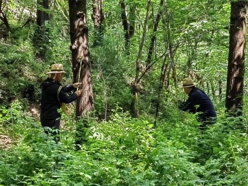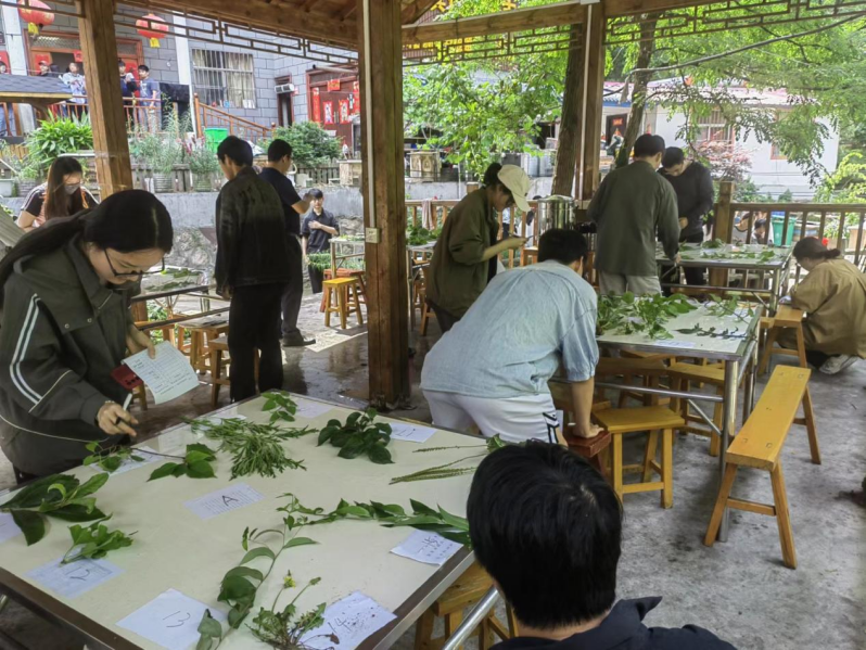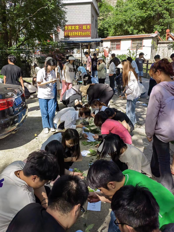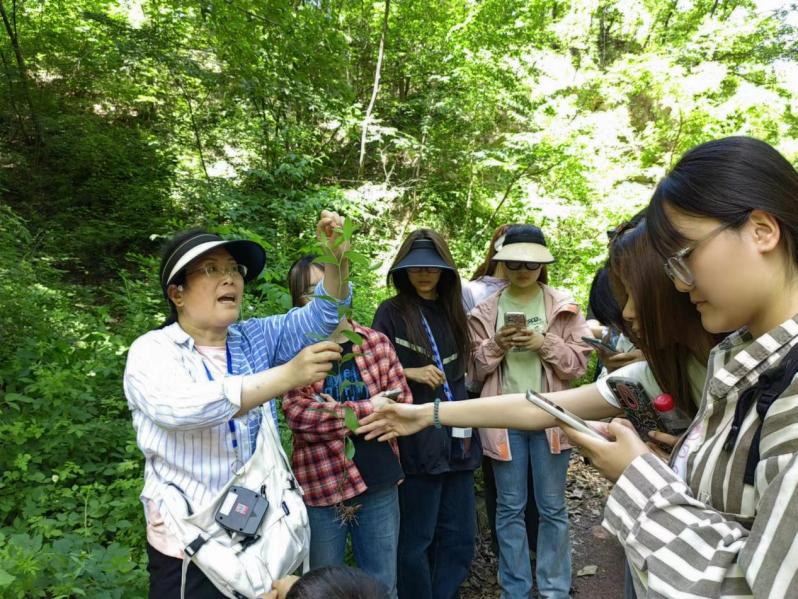 洛阳栾川龙峪湾地处亚热带和暖温带过渡地区,南北动植物交汇物种繁多,森林覆盖率达95%以上,有各种草本、木本植物1900多种,中草药800多种,是中原地区的“中草药宝库”,有很多是国家中药的保护品种,是河南省众多高校植物野外实习的场所。本次实习周的药用植物识别校外现场教学实习部分,学生分2批在龙峪湾进行。上山识别药用植物过程中,每批学生分为若干个小组,由专业教师带领,对沿途药用植物的名称、识别特征、药用部位、主要功效等进行详细讲解,学生们边听边记边拍照,并在老师的指导下适量采集一些药用植物标本,下午在老师的指导下对采集的药用植物标本再次进行识别。