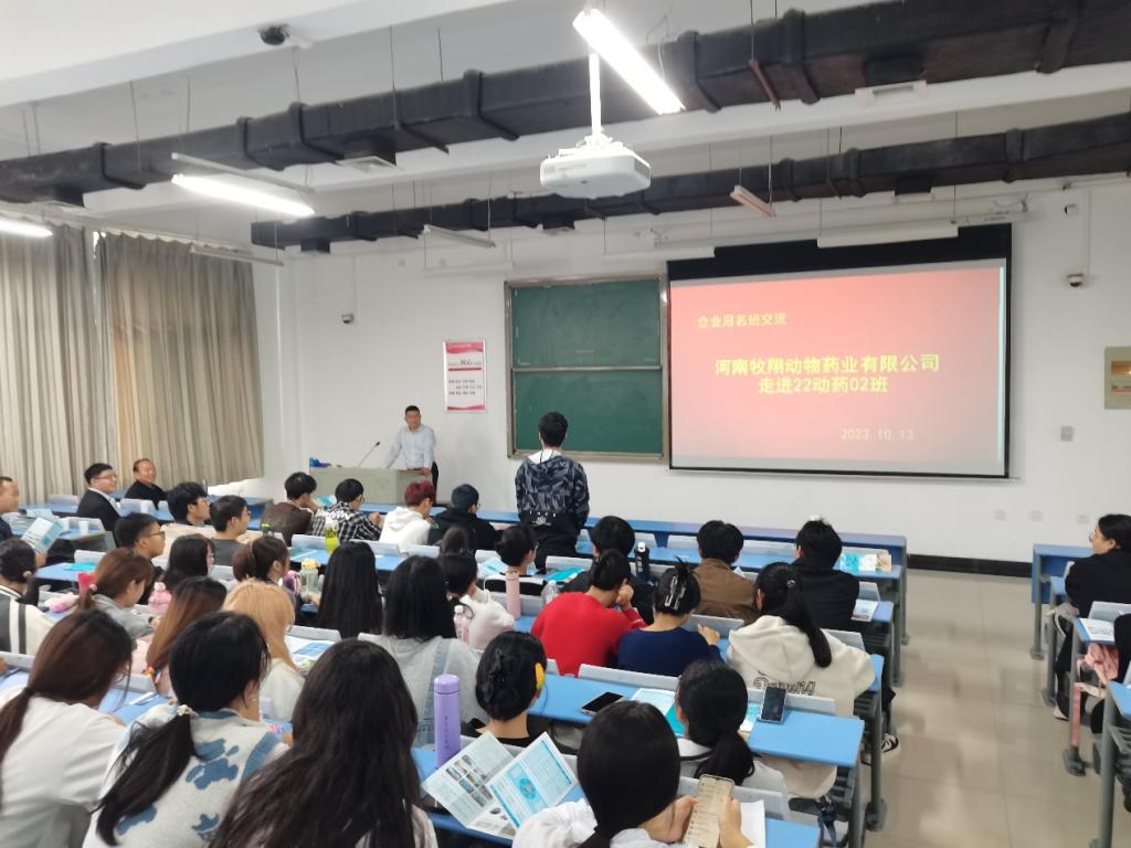 为深化校企合作,共育应用型人才,10月13日下午,在二号教学楼合班教室403,河南牧翔动物药业有限公司人事总监蒋吉勇总经理、企业班主任张印以及猪药首席畜牧师代广军与22动药2班全体同学们进行了交流。参加此次交流会的还有动物医药学院党委副书记汪洋、辅导员康宇、校方班主任王炼。