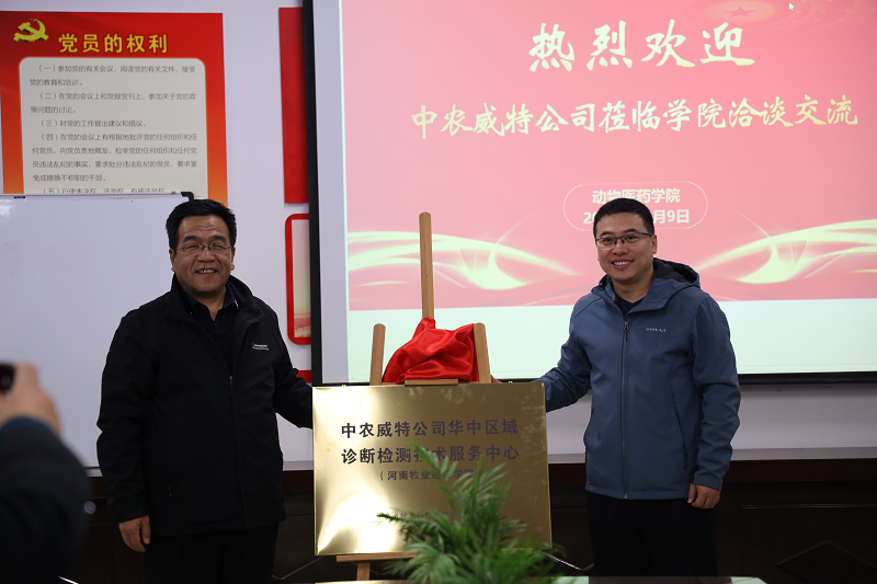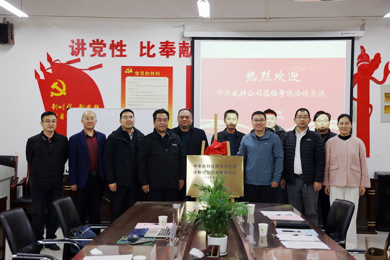 双方在融洽的氛围中就行业当前面临的疫病防控形势以及未来努力的方向进行了交流。中农威特生物科技股份有限公司为学院授予“华中区域诊断检测技术服务中心”铜牌,中农威特常务副总杨进才与学院院长宋予震共同为“华中区域诊断检测技术服务中心”进行了揭牌并合影留念。
