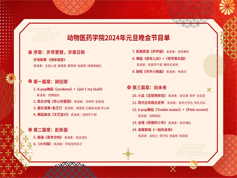 近一个月以来,在学院领导的高度重视下,在院团委的精心组织下,在全院师生的积极筹备下,元旦晚会节目形式多样,内容丰富,全院师生共同参与。此次晚会的成功举办不仅传递了彼此的祝福,拉近了师生之间的距离,同时也提供了展现个人魅力的平台,丰富了校园文化生活。新的一年,动物医药学院全体师生将继续守正创新,并肩携手,砥砺前行,谱写学院美好新篇章!(文/图 赵旭)