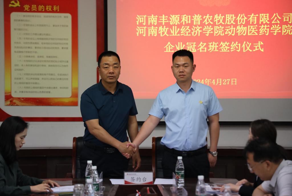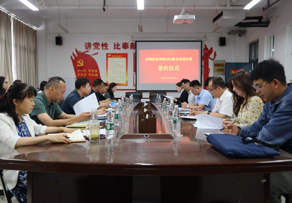进一步推进校企合作、产教融合工作,为学生实习、实训、就业提供更多空间,切实提高人才培养质量,4月27日15:00,动物医药学院于生工楼C401会议室举行2023级企业冠名班签约仪式。河南牧业经济学院教务处处长宋予震、动物医药学院党委书记胡卫东、副院长汤法银、党委副书记汪洋、副院长李利红、副院长吴玉臣、党政办主任樊明明、教学办主任吕玉金、科研办主任李向辉、团委副书记闫一博和牧原食品股份有限公司等12家企业的负责人出席签约仪式。签约仪式由动物医药学院团委副书记陈雁雪主持。