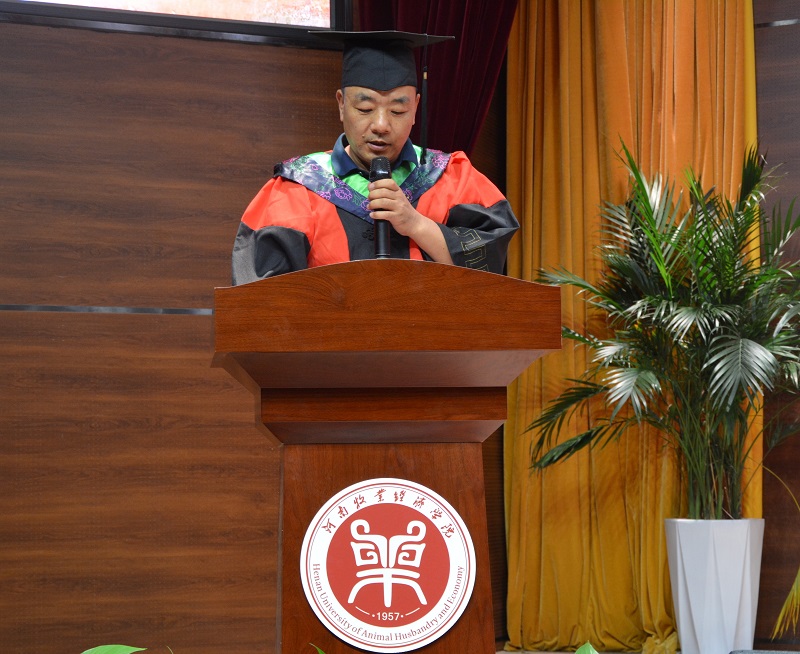 典礼在庄严的国歌声中拉开序幕。典礼伊始,副院长吴玉臣宣读了《关于授予王亚帆等761名同学学士学位的决定》,台上10位导师依次为获得学士学位的同学扶正流苏,颁发学士学位证书。党委书记胡卫东宣读了获得河南省优秀毕业生、河南牧业经济学院优秀毕业生、学院技能之星、学院文体活动卓越贡献者、学院优秀学生干部、学霸宿舍及学霸班级的名单,与会领导依次为获奖学生和班级颁奖。接下来毕业生代表王渤言表达了对学院领导老师的感谢和毕业前的依依惜别之情,在校生代表高少表达了他们将会接过学长学姐的接力棒,努力为学院发展进步贡献青春力量。教师代表朱丽飞博士向2024届毕业生送去了真挚的毕业寄语,期望同学们无论何时何地,能够始终如一地保持善良和纯真,学会理解、学会感恩、学会担当,自律自强,勇敢地去迎接人生中的每一次挑战,勇攀高峰,不断超越自我,实现自己的人生价值。最后学院副院长汤法银在总结讲话中对同学们在校期间勤奋学习、刻苦努力所取得的成绩以及对学院工作的支持和帮助给予了高度赞扬,并对同学们未来人生提出了殷切期望:一要坚定理想信念,要崇尚家国情怀的大德,初心如磐,信仰如炬;要崇尚造福于民的功德,知农爱农,强农兴农;要崇尚严于律己的私德,心有标尺,行有所止。二要弘扬奋斗精神,以敬业应对世界万千挑战,靠干事创业谋得生存,求得发展,获得尊重。三是要践行真善美,以修身笑对人生万千为人之道,修身、修学、修心,去拥抱剧烈的时代,去开启精彩的人生,去成就更好的自己,为实现中华民族伟大复兴奏响强国一代的铿锵之音、时代之歌。