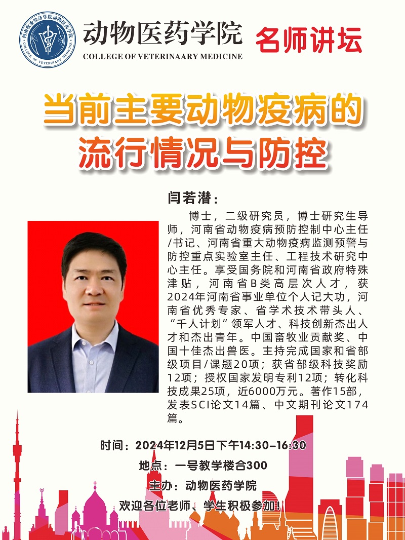 动物医药学院名师讲坛海报——当前主要动物疫病的流行情况与防控