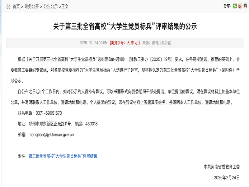 为深入学习贯彻习近平总书记关于青年工作的重要论述精神,进一步加强大学生党员队伍建设,发挥优秀大学生党员标杆作用,营造“学先进、赶先进、当标兵”的浓厚氛围,中共河南省委教育工委、河南省教育厅近日公布了第三批全省高校“大学生党员标兵”选树结果。经基层党组织推荐、学校专家评审、校党委研究审议、省级评选等环节,我院2022级动物医学专业学生李寒笑凭借过硬的政治素质和突出的先锋事迹,成功获评“河南省大学生党员标兵”荣誉称号。