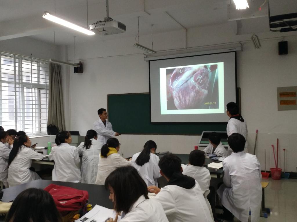 根据活动安排,2019年4月25日上午3、4节在生工组团楼C105室进行了由兽医病理学教研室的吴玉臣副教授主讲的研讨型观摩课,学校督导李婉涛、李梦云、教研室教师康静静、张桂云、吴凤笋等参加了此次观摩。吴玉臣老师是我院选派到西交利物浦大学学习的教师之一。本节内容吴老师讲授《兽医病理解剖学》课程中的病例讨论内容。吴老师以学生的兴趣为出发点,提前给学生安排相关病例内容,让结合自己的兴趣点,自行组建六个兴趣团队,完成自己的学习任务。学生在组建团队后将团队分工和集体讨论视频及讨论结果上传至蓝墨云班课,吴老师观看后进行线上指导。课堂上学生通过抽签的方式决定主讲顺序,让学生根据查阅的相关文献和讨论判断案例的病理变化、推测之前发生的病理变化,并初步判定发病原因,预测其预后。主讲学生讲述完毕后其他小组学生抢答补充答案,吴老师点评打分。所有环节结束后进行了针对本节内容的随堂测验。