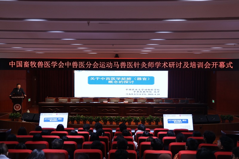 2023年4月22日上午,由我校承办的中国畜牧兽医学会中兽医学分会“运动马兽医针灸师学术研讨及培训会”开幕式在我校图书馆一楼学术报告厅顺利举办。开幕式结束后由中国畜牧兽医学会中兽医学会秘书长、中国农业大学范开教授讲授“关于中西医学脏腑(器官)概念的探讨”。本次活动由学院科研办公室主任李向辉主持。
