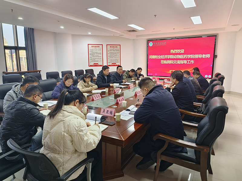 2024年12月18日,河南牧业经济学院动物医药学院党委书记胡卫东、副院长汤法银等人一行赴河南农业大学动物医学院开展交流学习。此次交流活动旨在推动双方在畜牧兽医教育领域的合作与发展,进一步促进优势互补、资源共享、共赢合作。