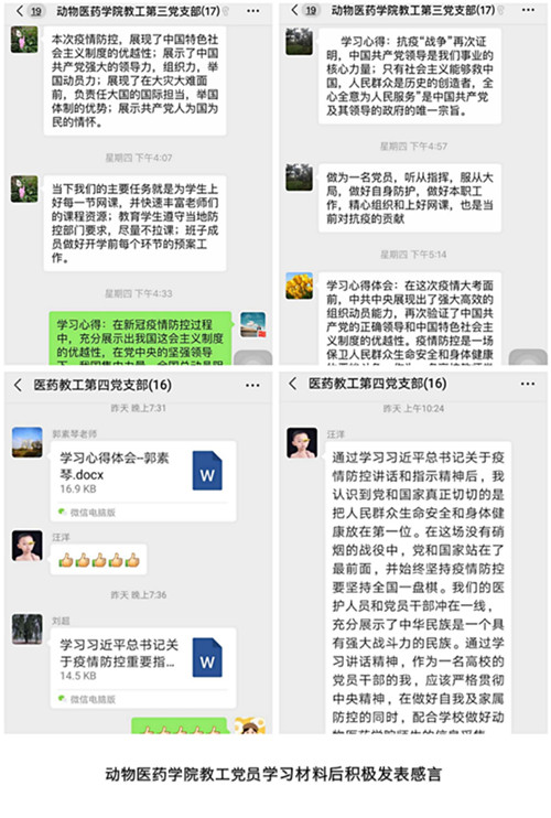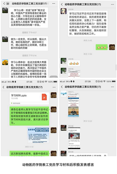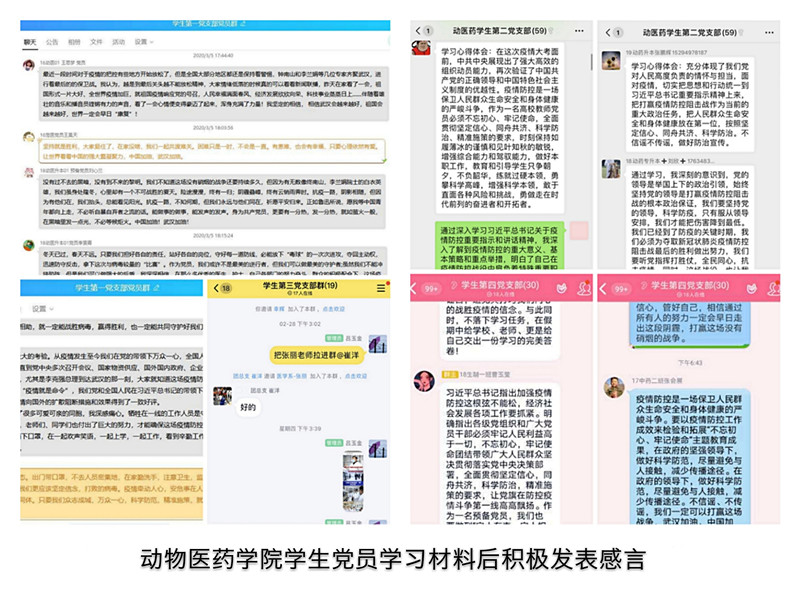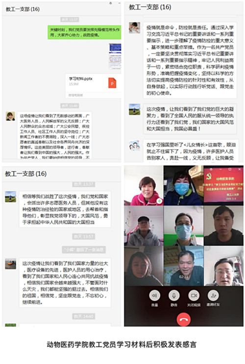 为进一步扎实推进疫情防控期间的各项工作,切实发挥基层党组织战斗堡垒作用和广大党员先锋模范作用,教育引导广大师生党员坚决贯彻好打赢疫情防控人民战、总体战、阻击战的各项任务要求,动物医药学院各党支部于近日利用网络平台分别开展了线上主题党日活动,深入学习贯彻习近平总书记关于疫情防控工作的重要讲话和指示批示精神。