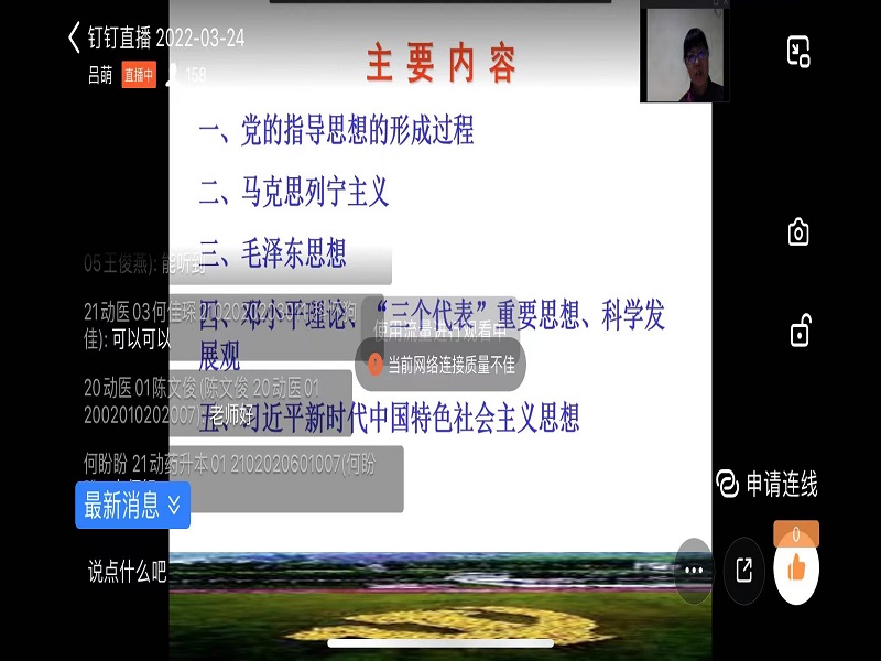为提高入党积极分子们的党性修养,加强入党积极分子对党的认识,积极开展我院党政工作、落实党内政策。3月24日晚,入党积极分子培训课程第二讲《党的指导思想》开讲,此次专题讲座由动物医药学院正处级组织员魏秀娟老师讲授,本期172名入党积极分子学员通过钉钉直播进行线上学习。