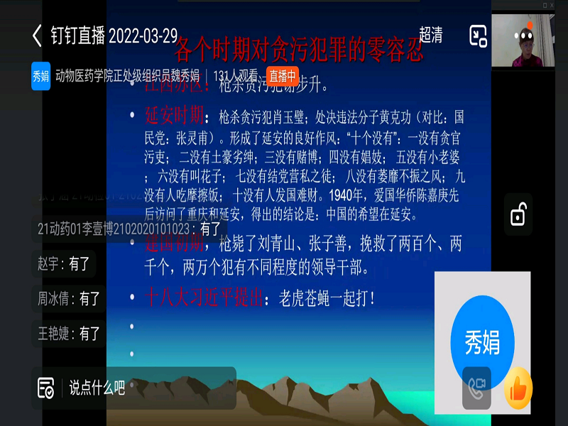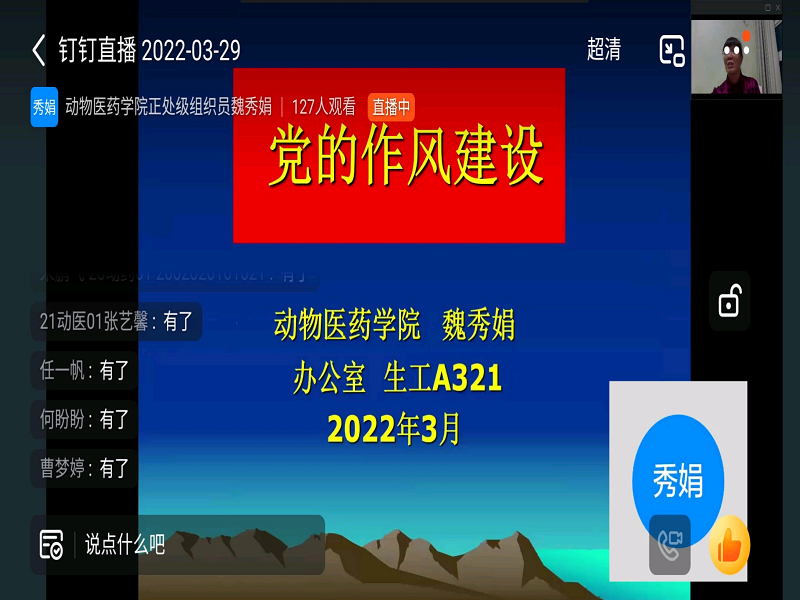为了加强我院入党积极分子对党的作风建设的深入了解,进一步帮助同学们深入学习有关党的基础理论与基本知识。3月29日晚,入党积极分子培训课程第六讲《党的作风建设》开讲。此次专题讲座由动物医药学院正处级组织员魏秀娟讲授,全体入党积极分子通过钉钉直播参加了本次党课。