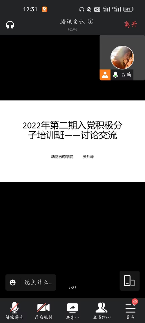 为提高入党积极分子入党的积极性,使各位学员更加严格地要求自己,努力向党组织看齐,10月16日中午,入党积极分子培训课程第六讲--《讨论交流》开课,在动物医药学院辅导员关兵峰老师的指导下,本期238名入党积极分子学员通过腾讯会议进行线上讨论交流。