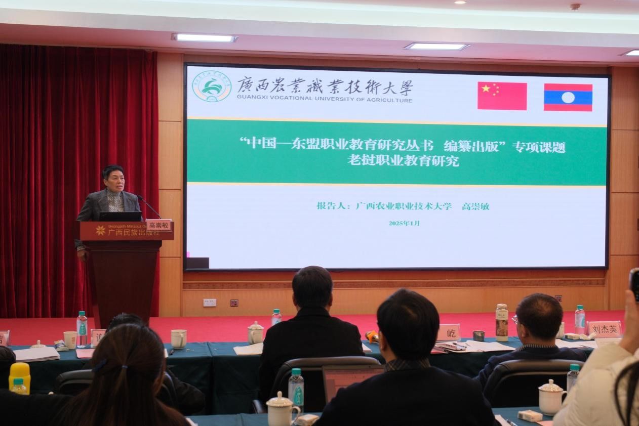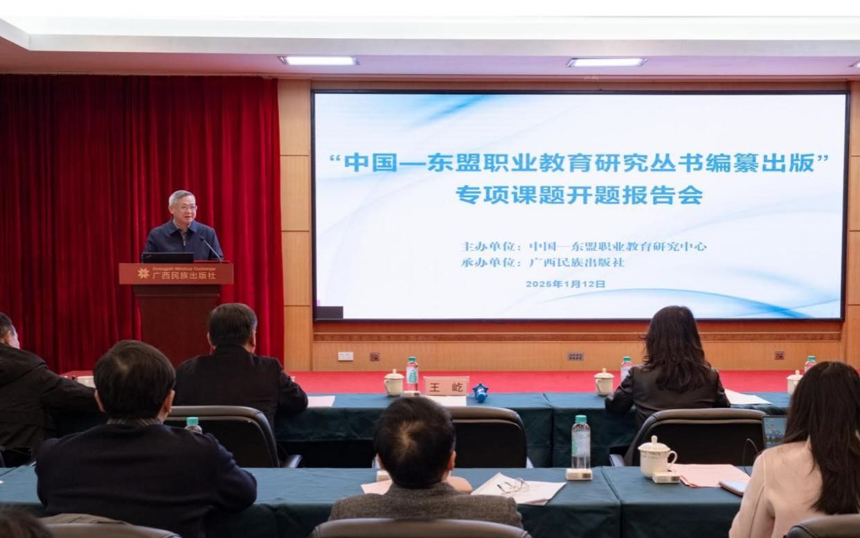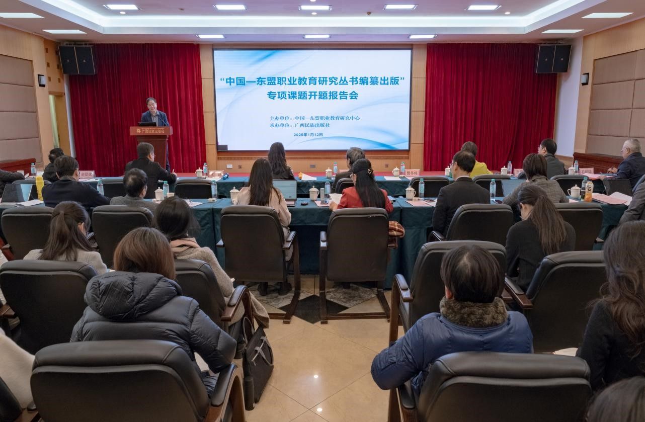 1月12日,由中国—东盟职业教育研究中心主办,广西民族出版社承办的“中国—东盟职业教育研究丛书编纂出版”专项课题开题报告会在南宁召开。多位职教领域的专家学者齐聚一堂,共同为项目开题把脉问诊,为丛书编纂出谋划策。我校校长、中国—东盟职业教育研究中心理事长李传起,广西民族出版社社长石朝雄出席会议并致辞。会议由中国—东盟职业教育研究中心常务副主任王屹主持。