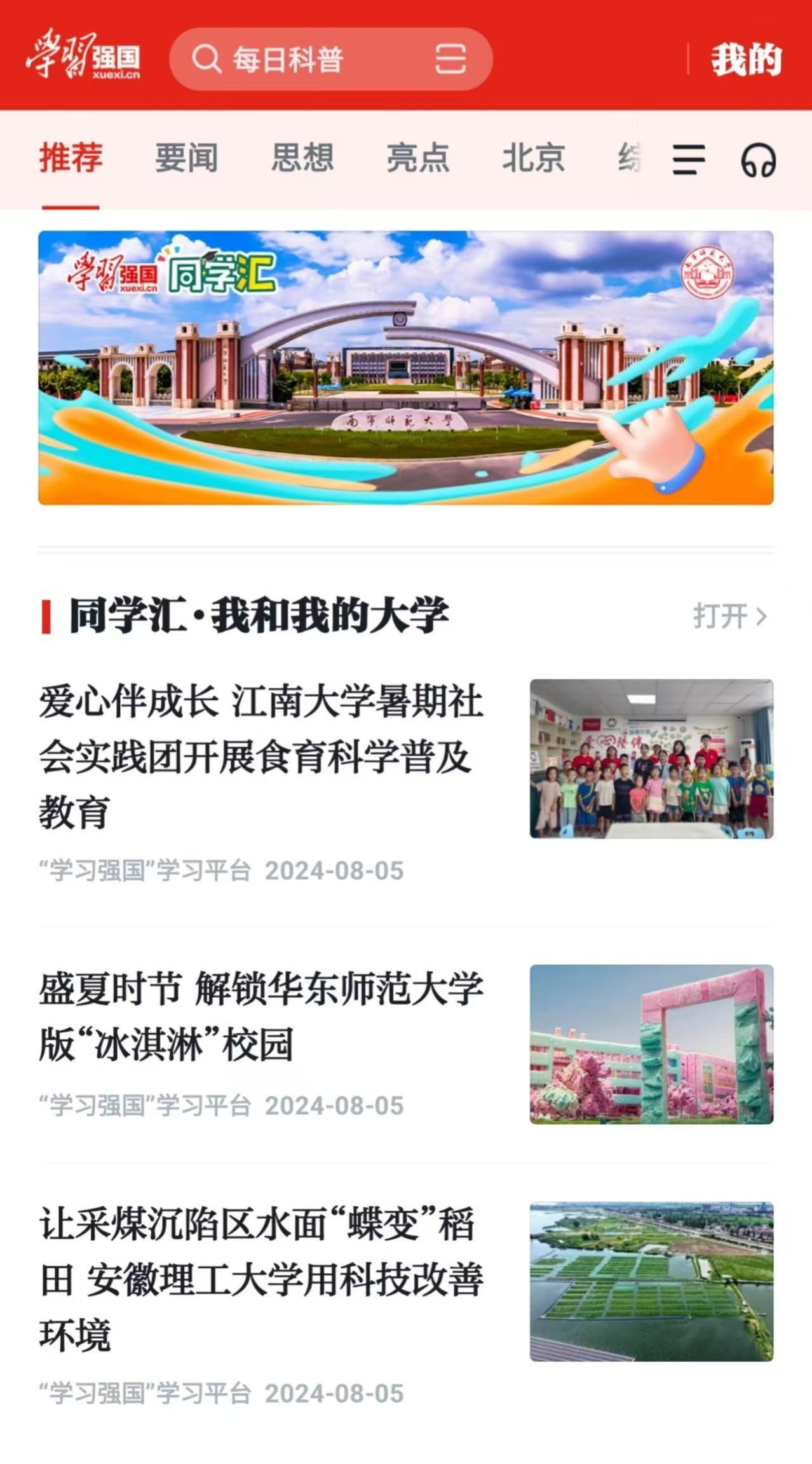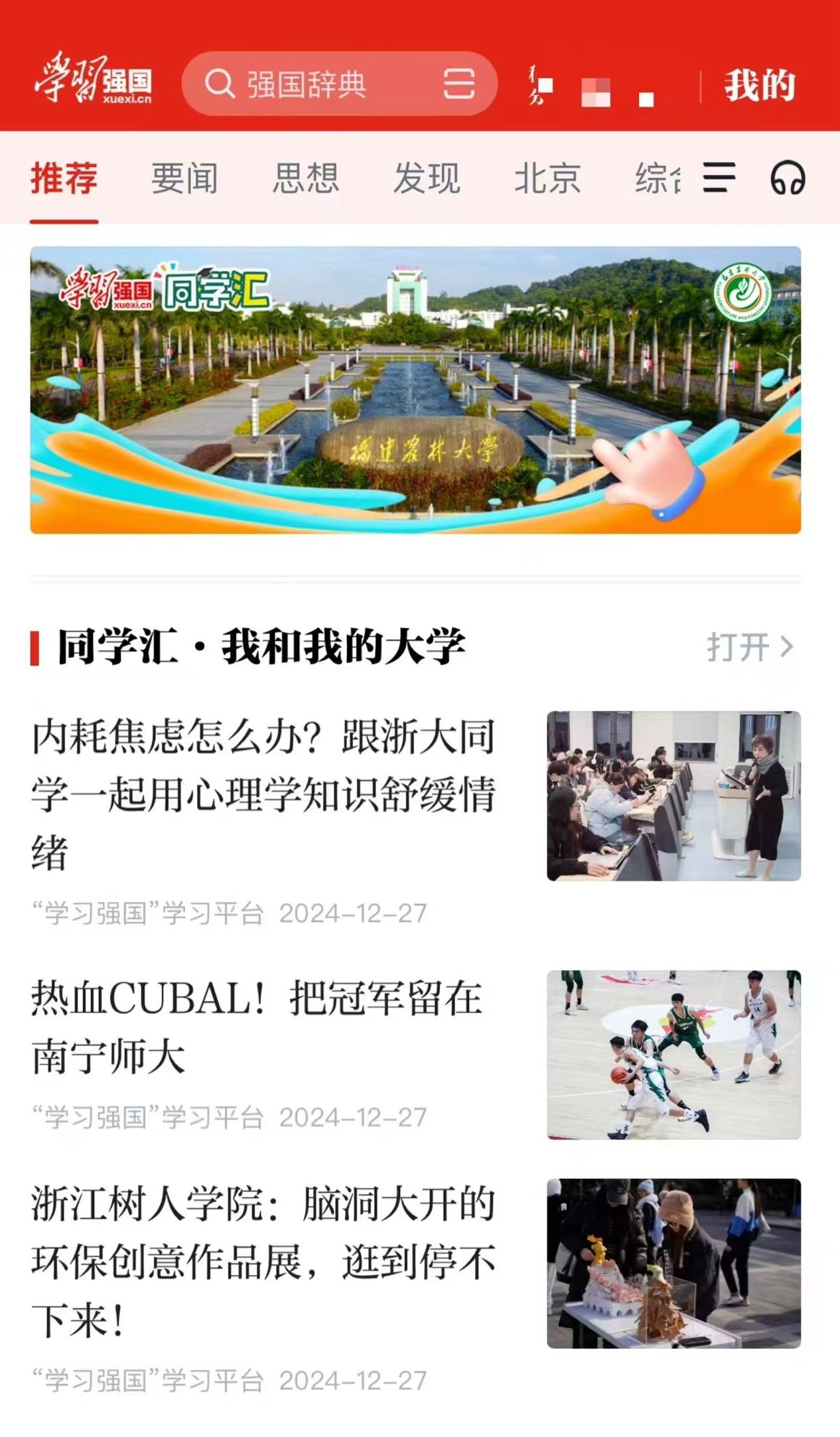 △学校优质内容获“学习强国”同学汇首页推荐