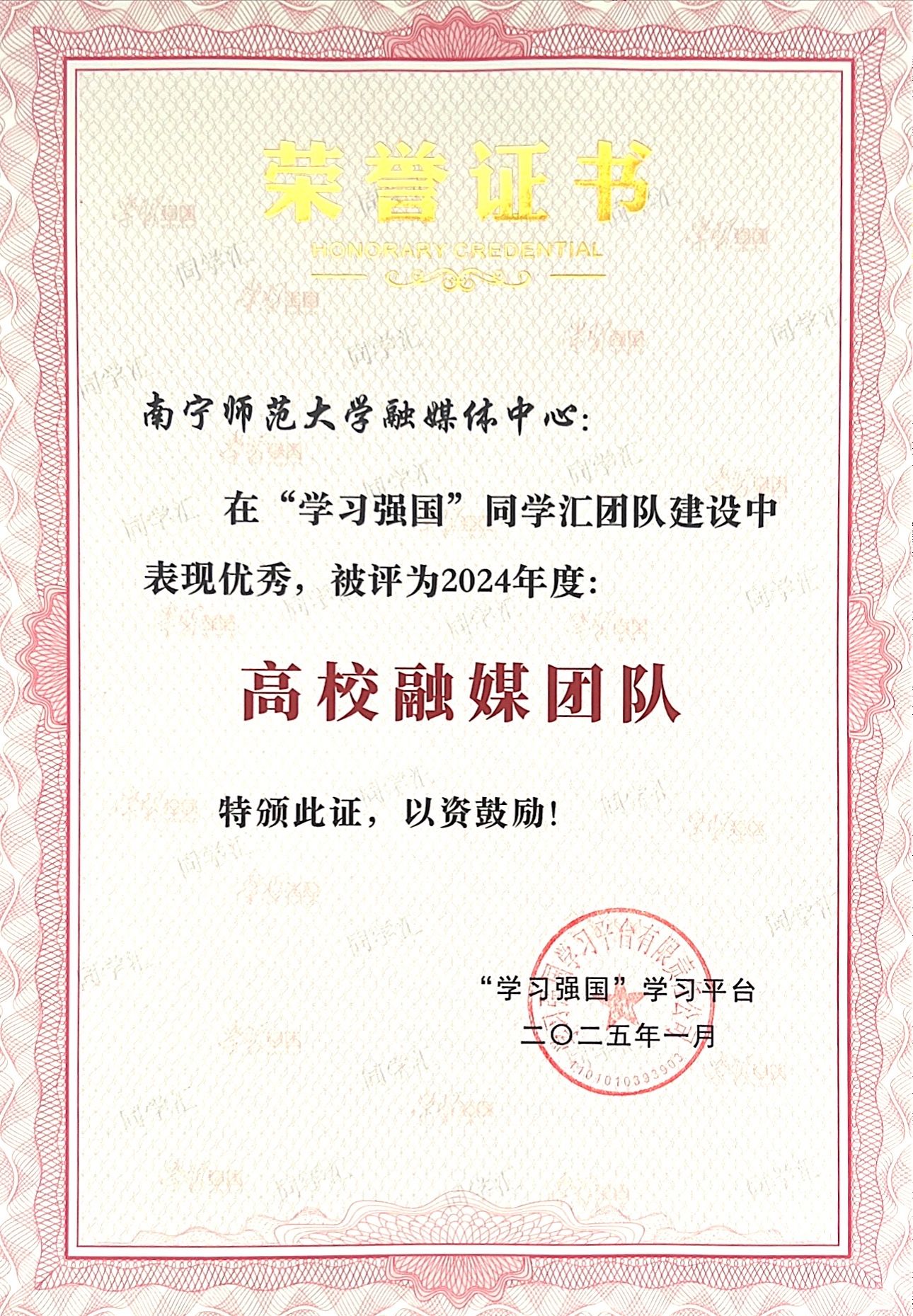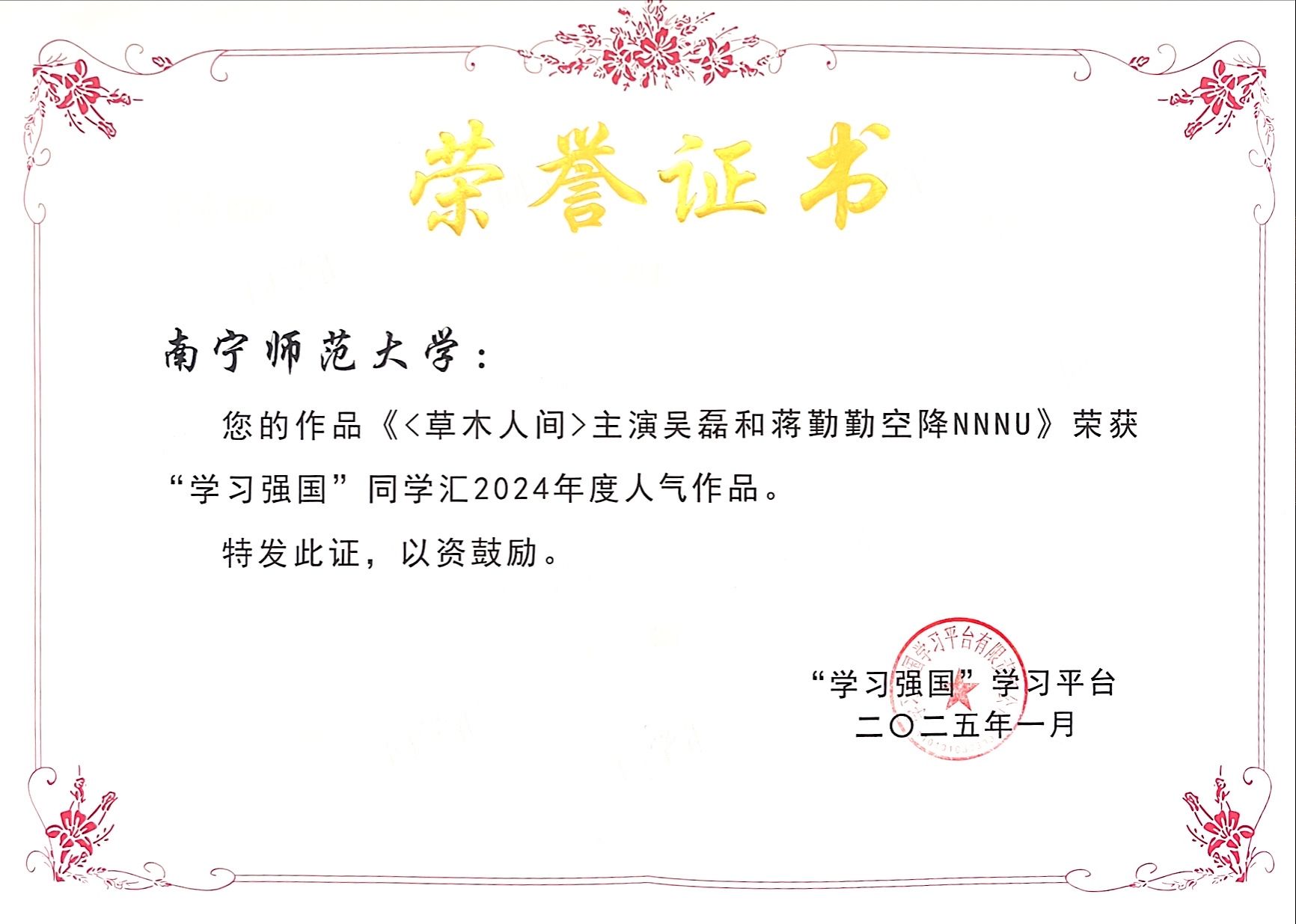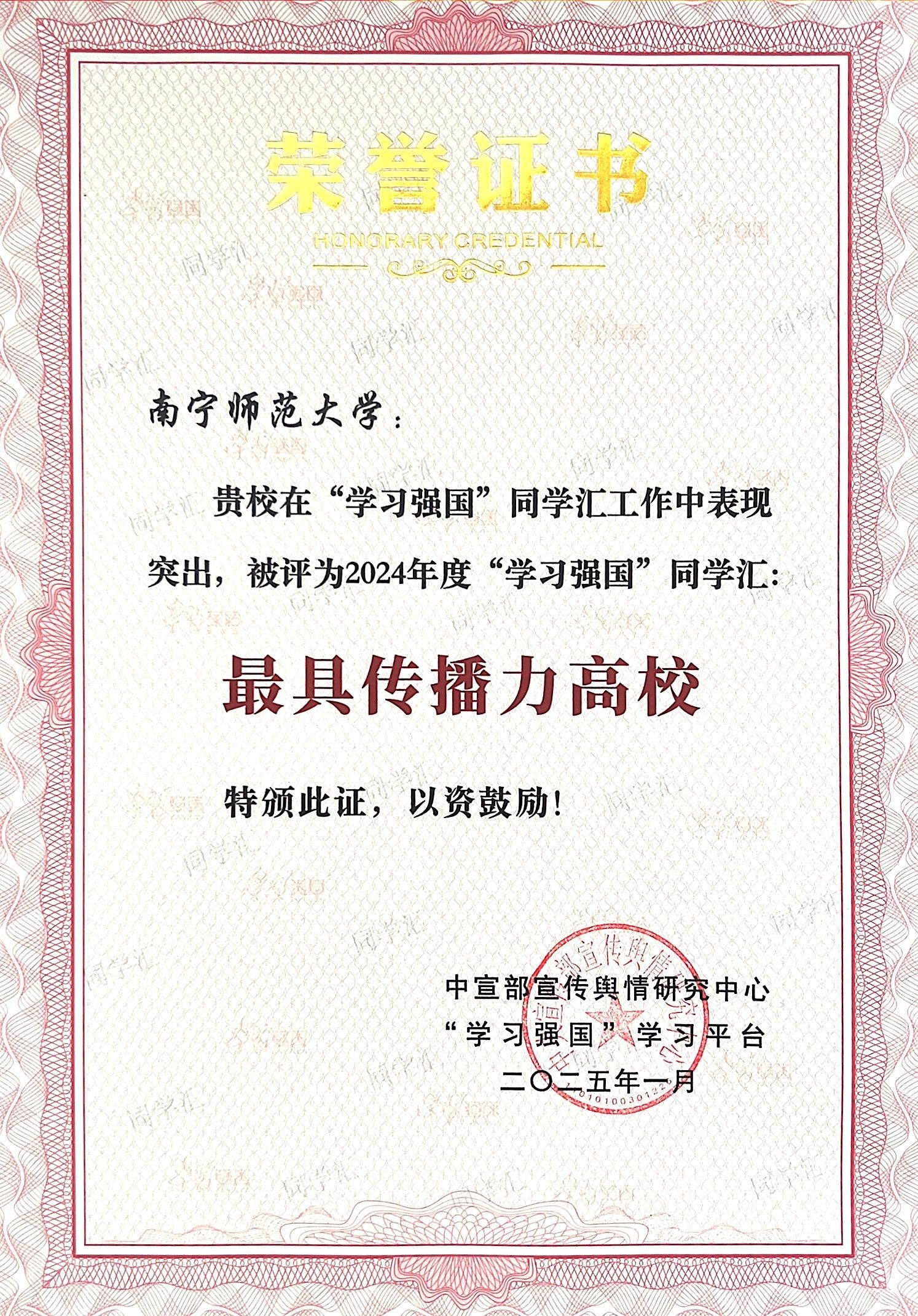 近日,中宣部宣传舆情研究中心、“学习强国”学习平台公布了“学习强国”同学汇2024年度评选结果,南宁师范大学获评“学习强国”同学汇“年度最具传播力高校”,南宁师范大学融媒体中心获评“学习强国”同学汇“年度高校融媒团队”,学校1件作品获评“学习强国”同学汇“年度高校人气作品”。